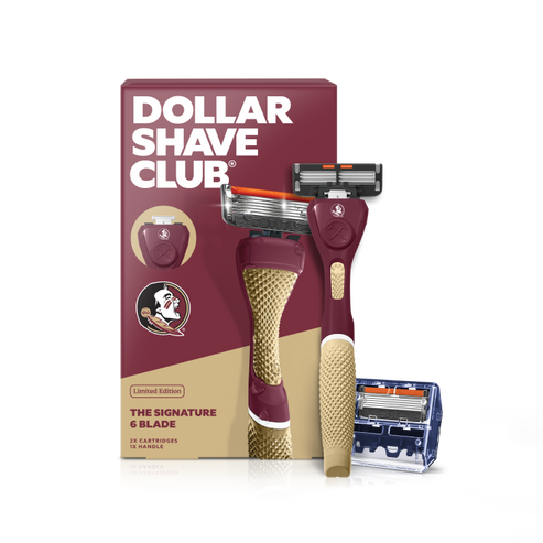 Your team. Your colors. Your face just got smoother with the Limited Edition Gift Set that includes our sturdy Diamond Grip handle repping school colors, two Signature 6 Blade cartridges with a precision trimmer for tricky spots, and a JUICY lube strip infused with Aloe + Vitamin E.