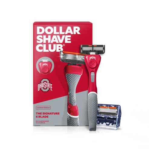 Your team. Your colors. Your face just got smoother with the Limited Edition Gift Set that includes our sturdy Diamond Grip handle repping school colors, two Signature 6 Blade cartridges with a precision trimmer for tricky spots, and a JUICY lube strip infused with Aloe + Vitamin E.