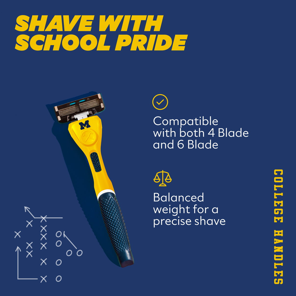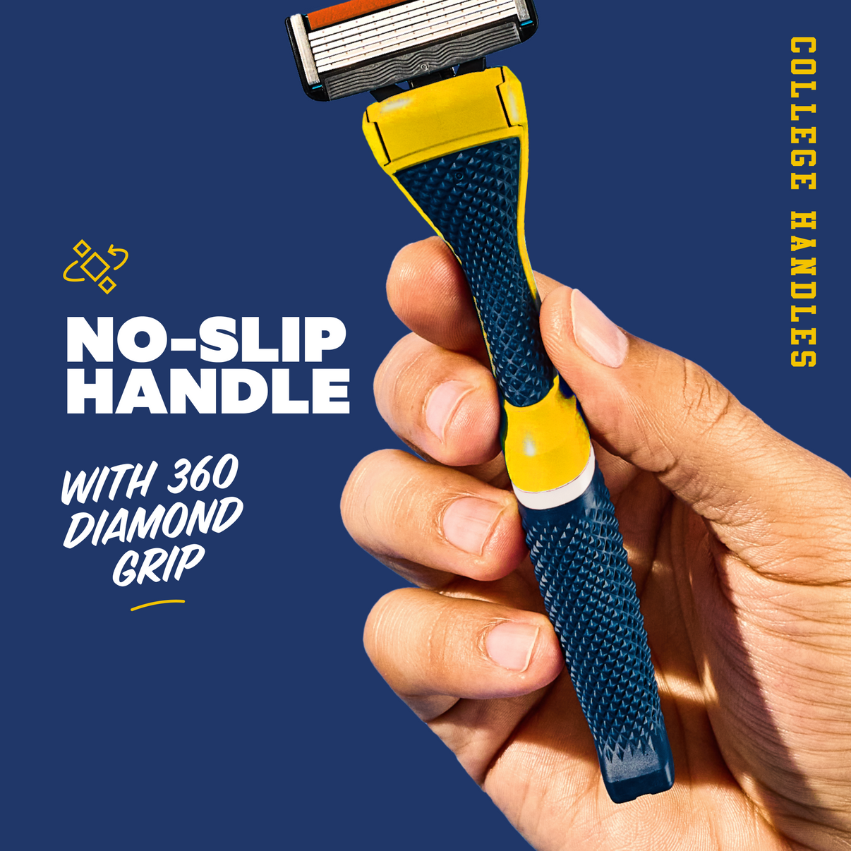 Your team. Your colors. Our limited-edition collegiate handles are built to rep school spirit from the sink to the stadium. Whether you go with our 4 Blade Club Series or 6 Blade Club Series cartridge, both are compatible with this weighty, diamond-patterned grip handle designed for ultimate comfort and control.