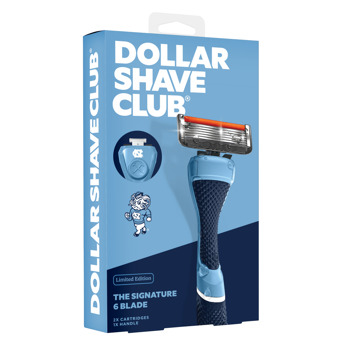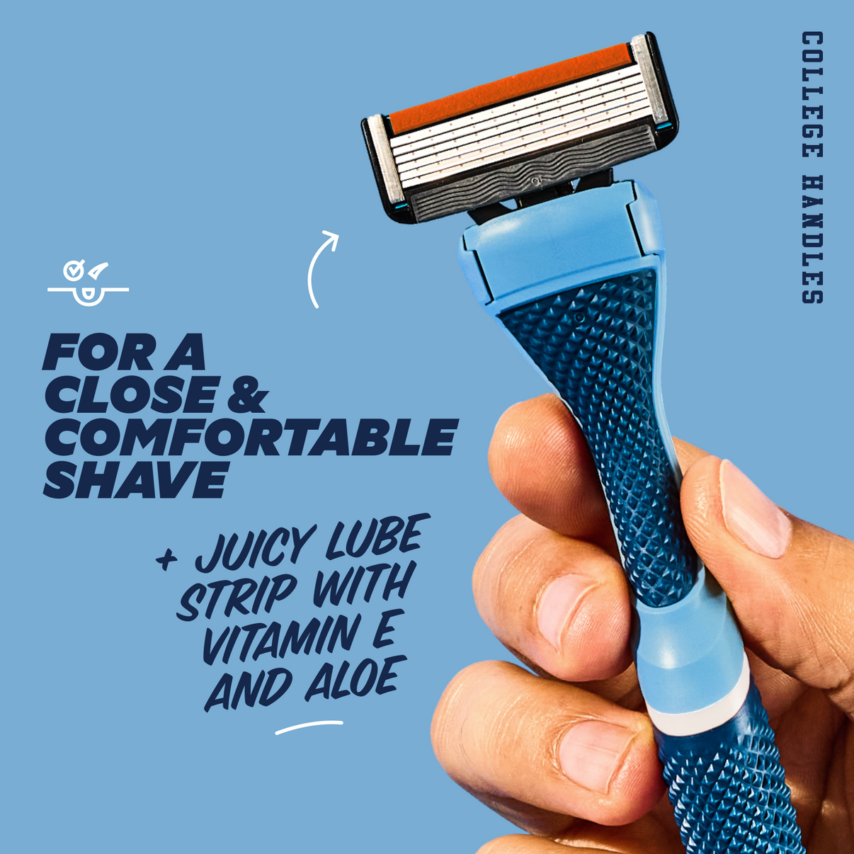 Your team. Your colors. Your face just got smoother with the Limited Edition Gift Set that includes our sturdy Diamond Grip handle repping school colors, two Signature 6 Blade cartridges with a precision trimmer for tricky spots, and a JUICY lube strip infused with Aloe + Vitamin E.