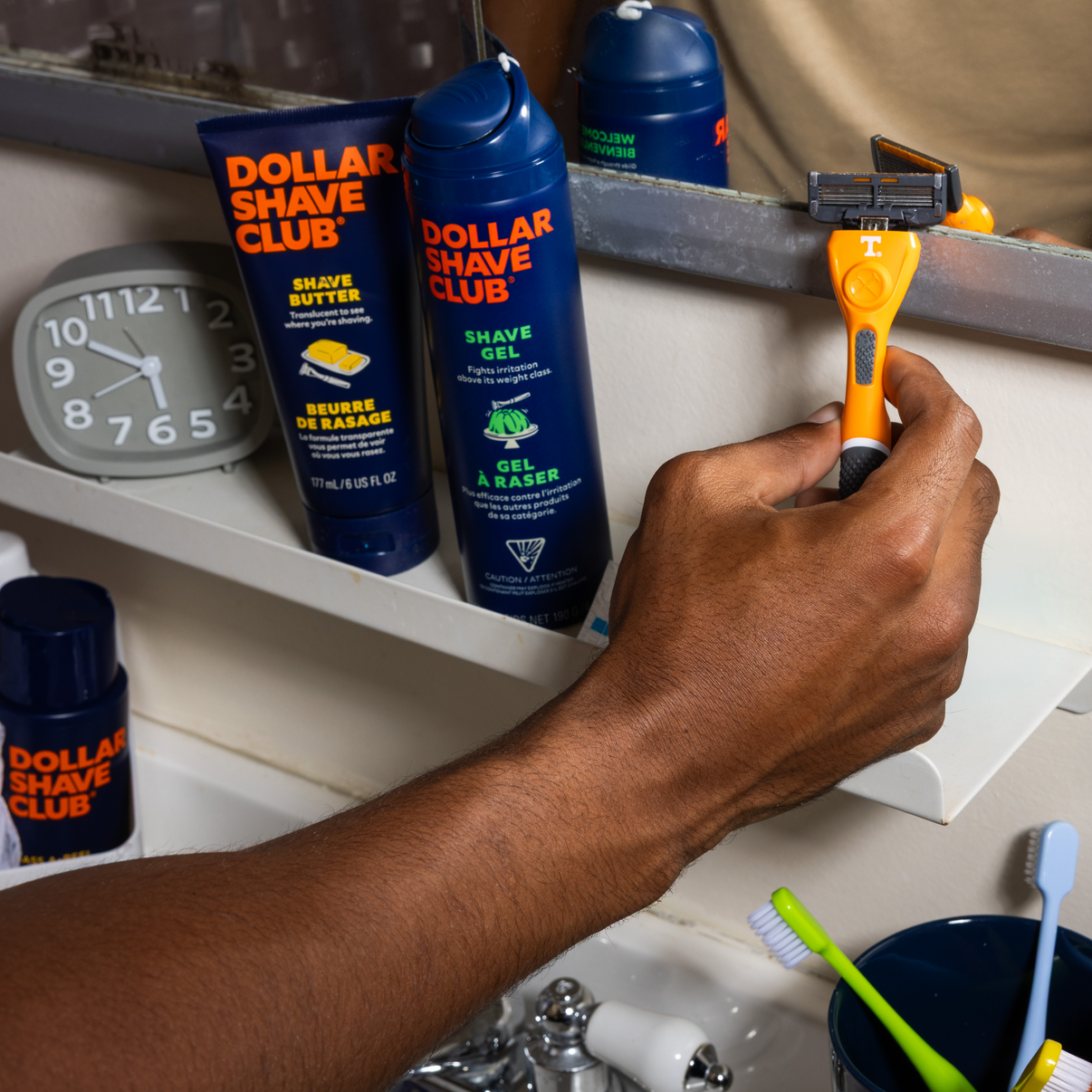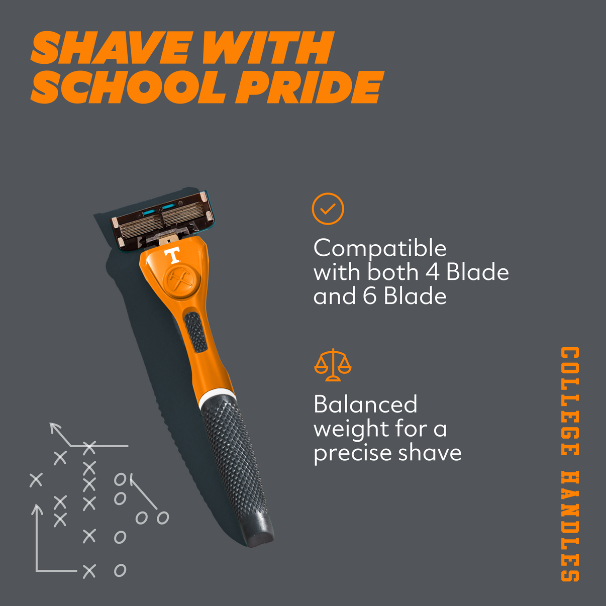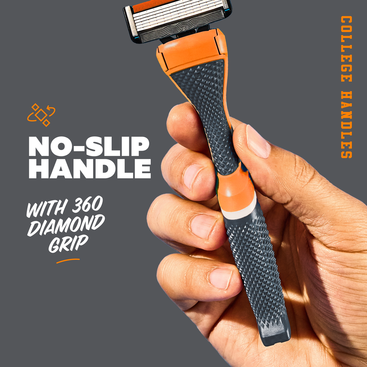 Your team. Your colors. Our limited-edition collegiate handles are built to rep school spirit from the sink to the stadium. Whether you go with our 4 Blade Club Series or 6 Blade Club Series cartridge, both are compatible with this weighty, diamond-patterned grip handle designed for ultimate comfort and control.