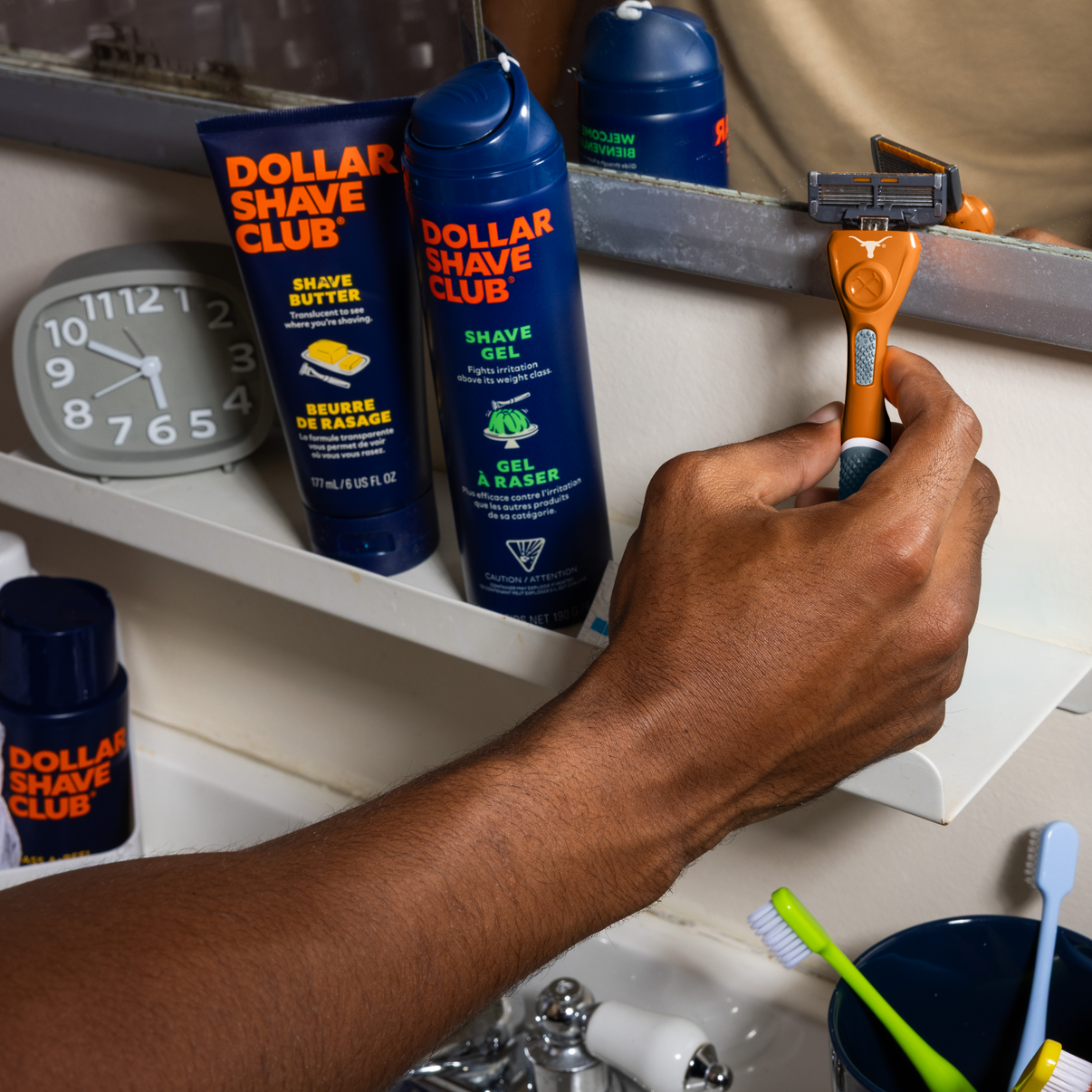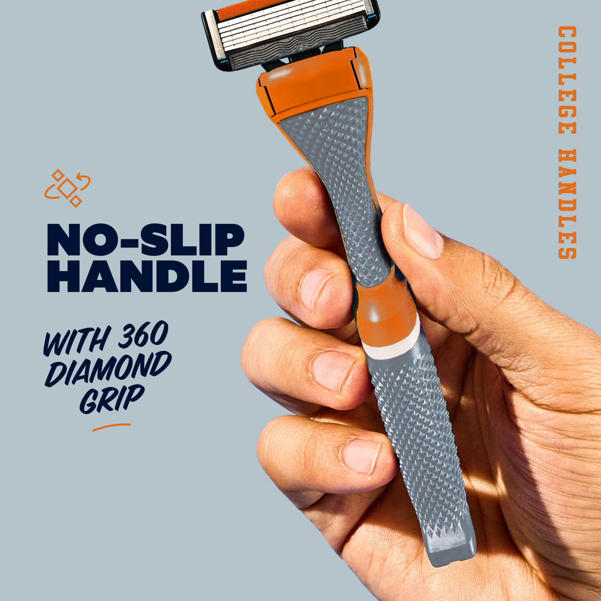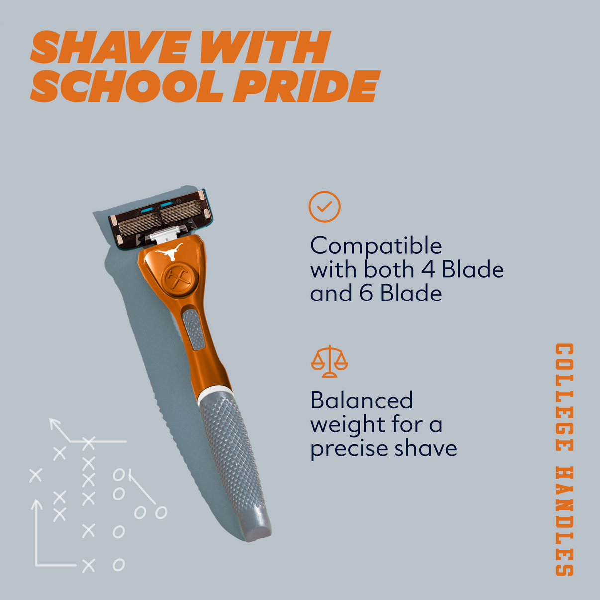 Your team. Your colors. Our limited-edition collegiate handles are built to rep school spirit from the sink to the stadium. Whether you go with our 4 Blade Club Series or 6 Blade Club Series cartridge, both are compatible with this weighty, diamond-patterned grip handle designed for ultimate comfort and control.